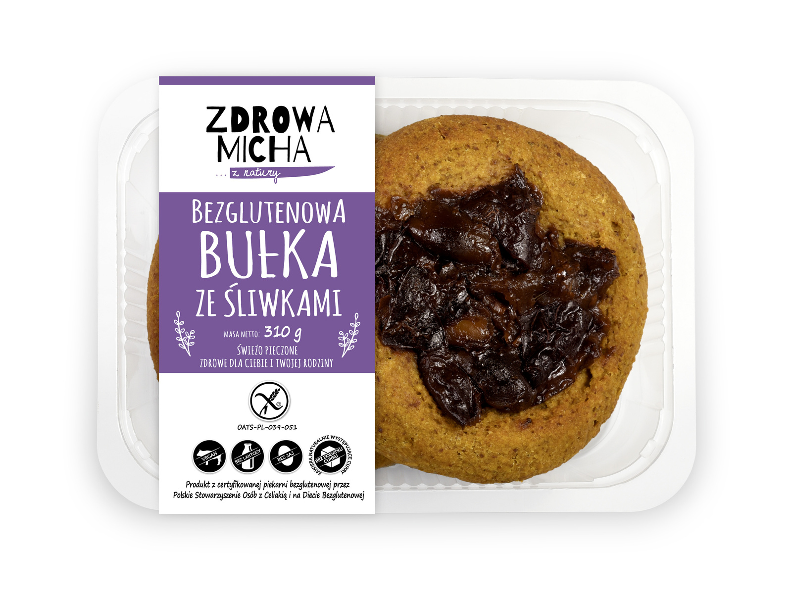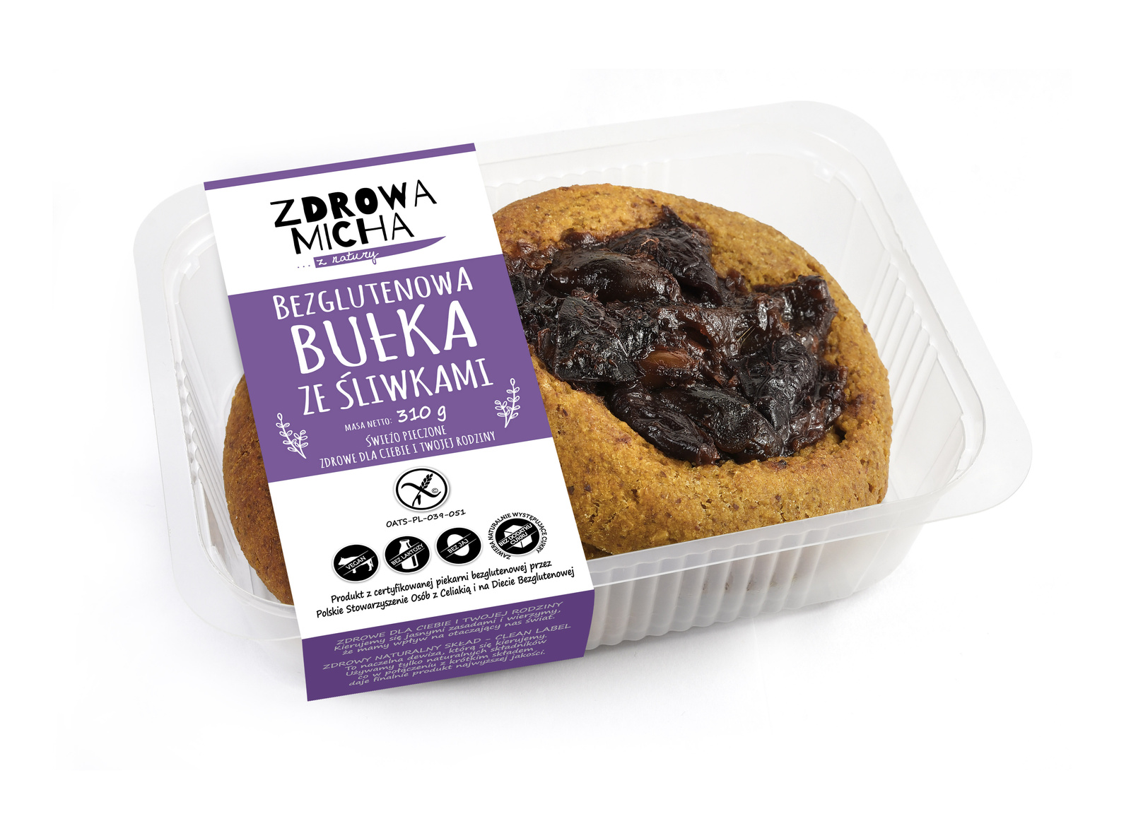 Bezglutenowa bułka ze śliwkami to propozycja dla osób dbających o zdrowie oraz tych z celiakią czy na diecie bezglutenowej. Wykonana w 100% z naturalnych składników, charakteryzuje się niską kalorycznością, co czyni ją idealnym elementem codziennej diety dzieci, młodzieży i dorosłych. Jej lekko słodki smak z delikatną kwaskowatością śliwek sprawia, że jest sycąca i nie kruszy się. Bułkę drożdżową ze śliwkami można mrozić oraz podgrzewać w temperaturze 180°C przez 3 minuty w celu odświeżenia.